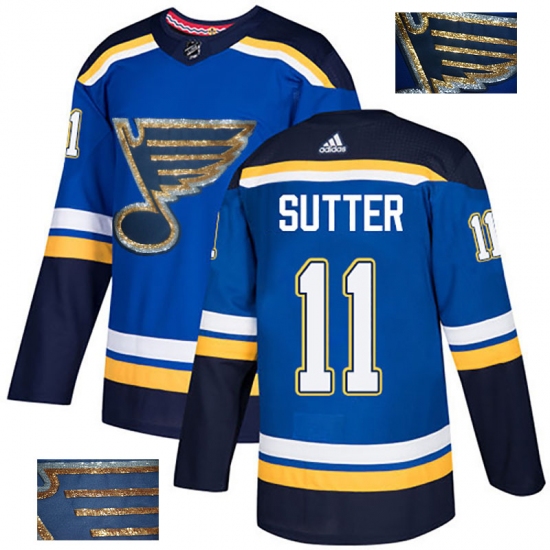 >Men's Adidas St. Louis Blues #11 Brian Sutter Authentic Royal Blue Fashion Gold NHL Jersey