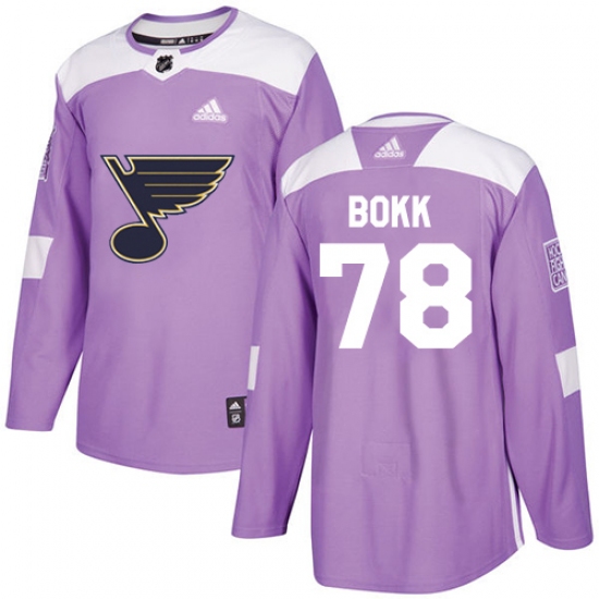 >Men's Adidas St. Louis Blues #78 Dominik Bokk Authentic Purple Fights Cancer Practice NHL Jersey