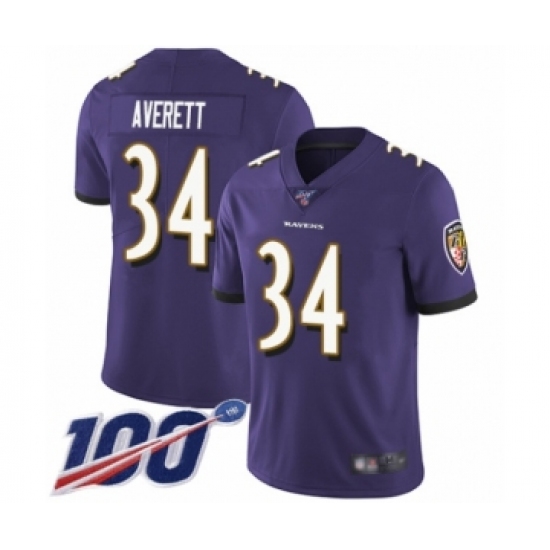 Men's Baltimore Ravens #34 Anthony Averett Purple Team Color Vapor Untouchable Limited Player 100th Season Football Jersey