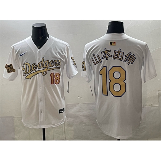 >Men's Los Angeles Dodgers #18 山本由伸 White Gold 2025 World Series Limited Stitched Baseball Jersey