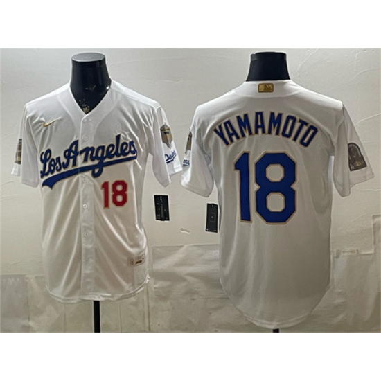 >Men's Los Angeles Dodgers #18 Yoshinobu Yamamoto White 2026 Gold Collection 9x & B2B Champs Stitched Baseball Jersey