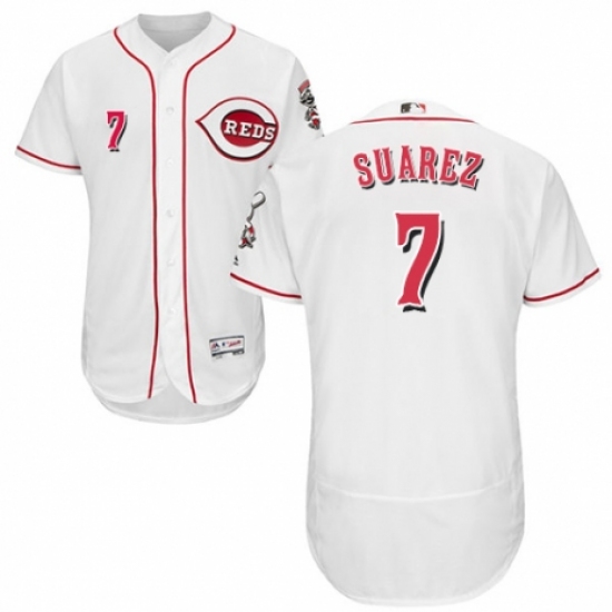 >Men's Majestic Cincinnati Reds #7 Eugenio Suarez White Home Flex Base Authentic Collection MLB Jersey