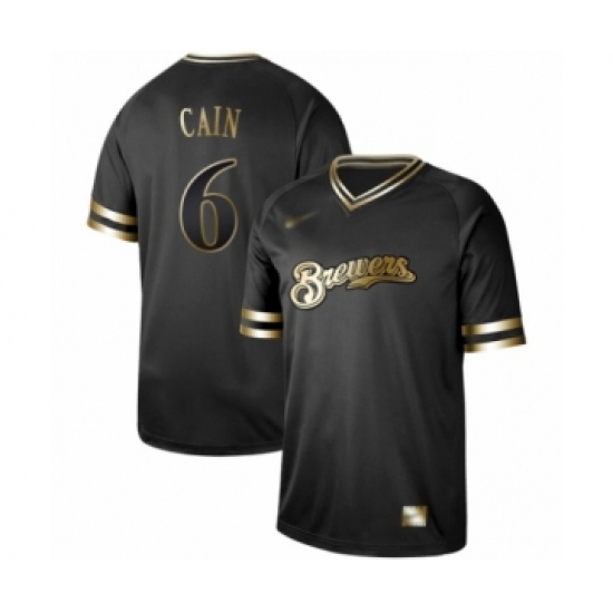 >Men's Milwaukee Brewers #6 Lorenzo Cain Authentic Black Gold Fashion Baseball Jersey