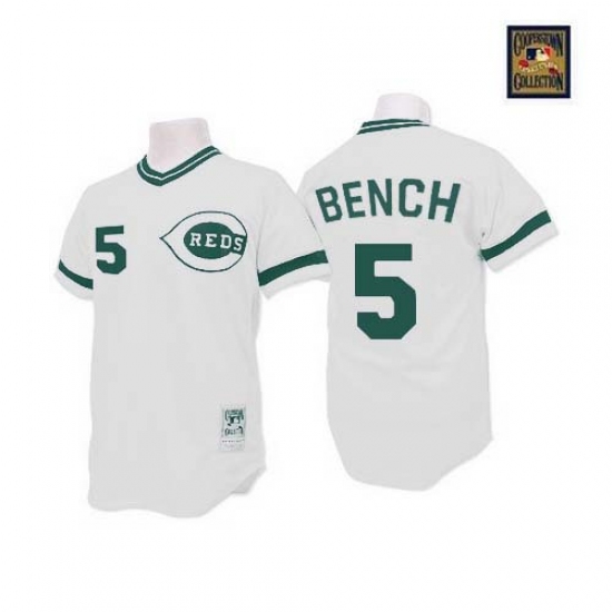 Home>MLB>Cincinnati Reds>Johnny Bench>Men's Mitchell and Ness Cincinnati Reds #5 Johnny Bench Authentic White(Green Patch) Throwback MLB Jersey