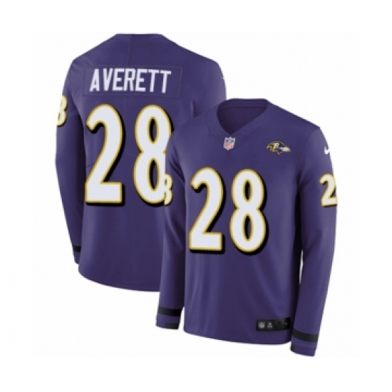 >Men's Nike Baltimore Ravens #28 Anthony Averett Limited Purple Therma Long Sleeve NFL Jersey