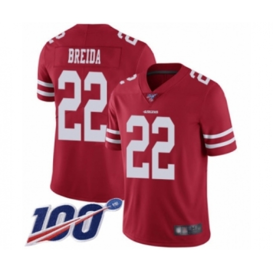 Men's San Francisco 49ers #22 Matt Breida Red Team Color Vapor Untouchable Limited Player 100th Season Football Jersey