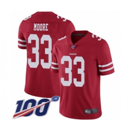 Men's San Francisco 49ers #33 Tarvarius Moore Red Team Color Vapor Untouchable Limited Player 100th Season Football Jersey