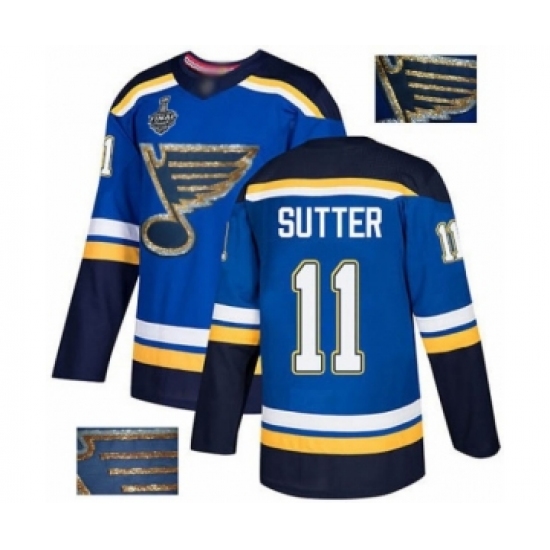 >Men's St. Louis Blues #11 Brian Sutter Authentic Royal Blue Fashion Gold 2019 Stanley Cup Final Bound Hockey Jersey