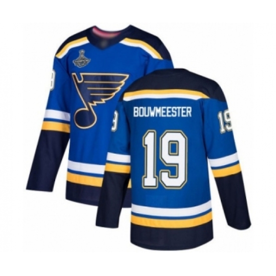 >Men's St. Louis Blues #19 Jay Bouwmeester Authentic Royal Blue Home 2019 Stanley Cup Champions Hockey Jersey