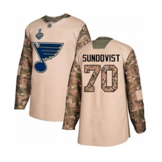 >Men's St. Louis Blues #70 Oskar Sundqvist Authentic Camo Veterans Day Practice 2019 Stanley Cup Final Bound Hockey Jersey
