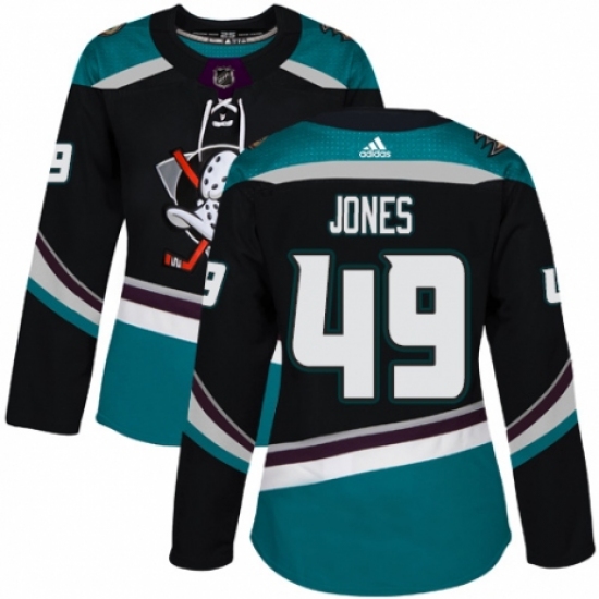 >Women's Adidas Anaheim Ducks #49 Max Jones Premier Black Teal Alternate NHL Jersey