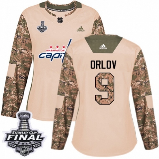>Women's Adidas Washington Capitals #9 Dmitry Orlov Authentic Camo Veterans Day Practice 2018 Stanley Cup Final NHL Jersey