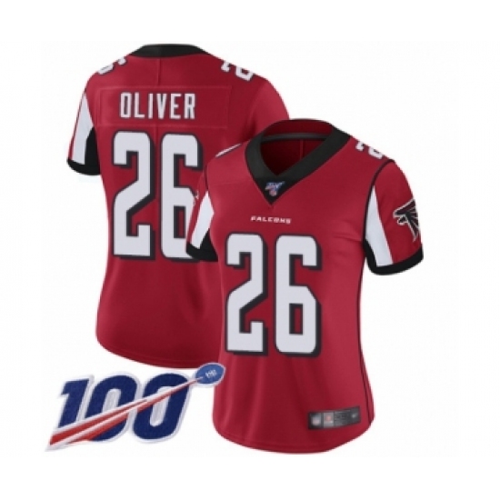 >Women's Atlanta Falcons #26 Isaiah Oliver Red Team Color Vapor Untouchable Limited Player 100th Season Football Jersey