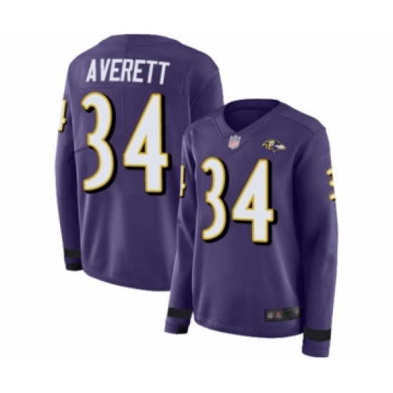 >Women's Baltimore Ravens #34 Anthony Averett Limited Purple Therma Long Sleeve Football Jersey