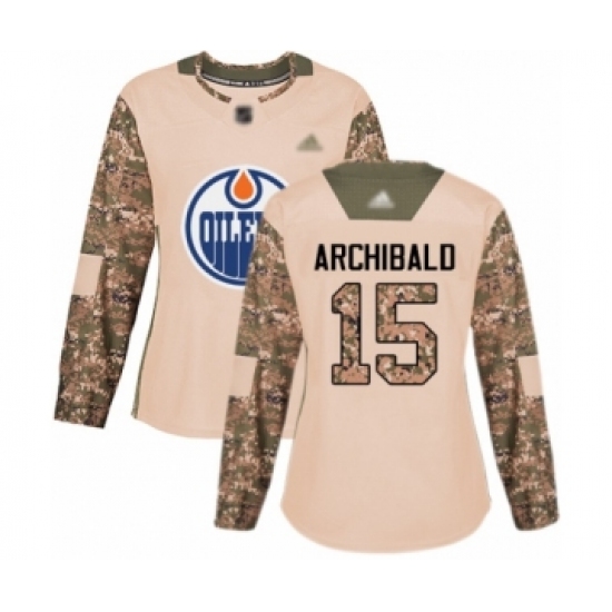 >Women's Edmonton Oilers #15 Josh Archibald Authentic Camo Veterans Day Practice Hockey Jersey