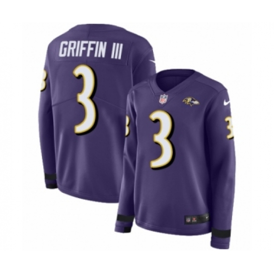>Women's Nike Baltimore Ravens #3 Robert Griffin III Limited Purple Therma Long Sleeve NFL Jersey