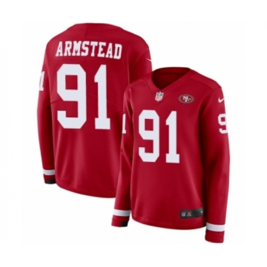 >Women's Nike San Francisco 49ers #91 Arik Armstead Limited Red Therma Long Sleeve NFL Jersey