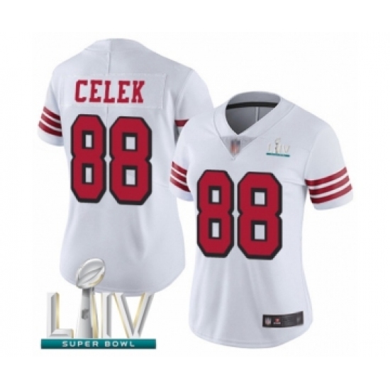 Women's San Francisco 49ers #88 Garrett Celek Limited White Rush Vapor Untouchable Super Bowl LIV Bound Football Jersey