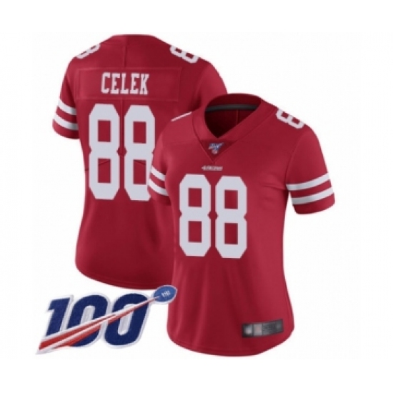 Women's San Francisco 49ers #88 Garrett Celek Red Team Color Vapor Untouchable Limited Player 100th Season Football Jersey
