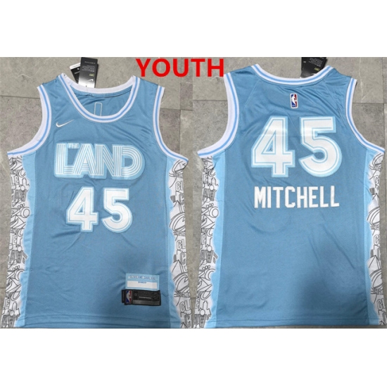 >Youth Cleveland Cavaliers #45 donovan mitchell light blue 2024 city edition stitched jersey