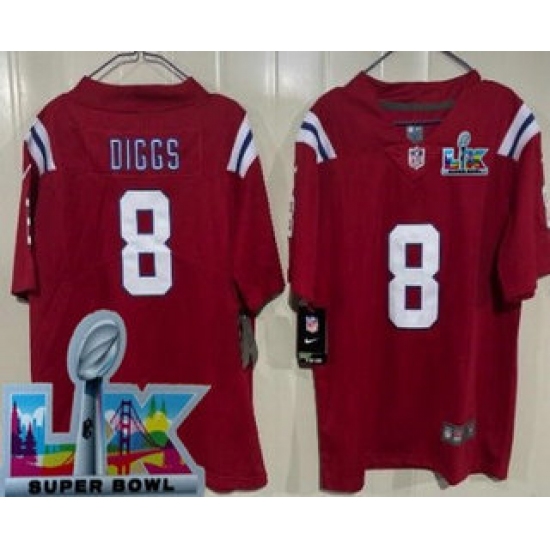 >Youth New England Patriots #8 Stefon Diggs Limited Red Super Bowl LX Vapor Jersey