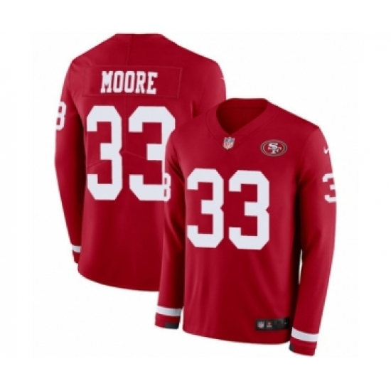 >Youth Nike San Francisco 49ers #33 Tarvarius Moore Limited Red Therma Long Sleeve NFL Jersey