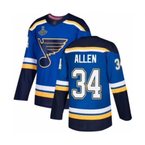 >Youth St. Louis Blues #34 Jake Allen Authentic Royal Blue Home 2019 Stanley Cup Champions Hockey Jersey