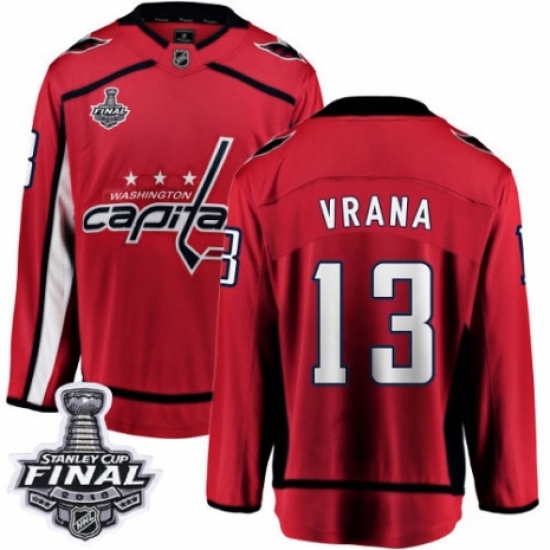 Men's Washington Capitals #13 Jakub Vrana Fanatics Branded Red Home Breakaway 2018 Stanley Cup Final Champions NHL Jersey