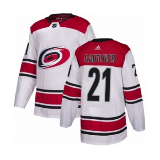 >Men's Adidas Carolina Hurricanes #21 Julien Gauthier Authentic White Away NHL Jersey