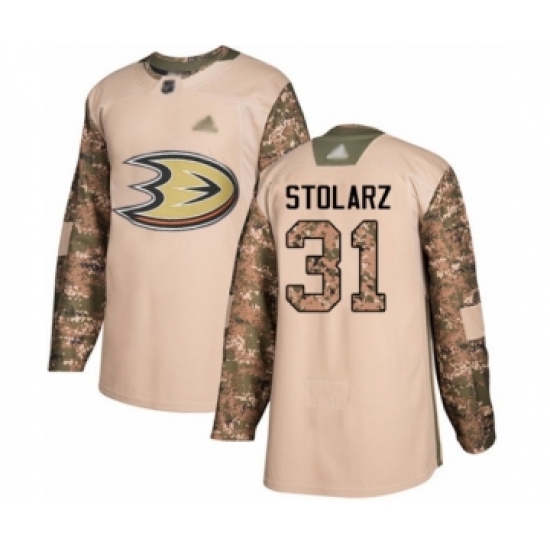 >Men's Anaheim Ducks #31 Anthony Stolarz Authentic Camo Veterans Day Practice Hockey Jersey