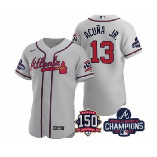Men's Atlanta Braves #13 Ronald Acuna Jr. 2021 Gray World Series Champions With 150th Anniversary Flex Base Stitched Jersey