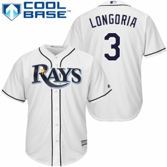 >Men's Majestic Tampa Bay Rays #3 Evan Longoria Replica White Home Cool Base MLB Jersey