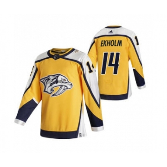 Men's Nashville Predators #14 Mattias Ekholm Yellow 2020-21 Reverse Retro Alternate Hockey Jersey