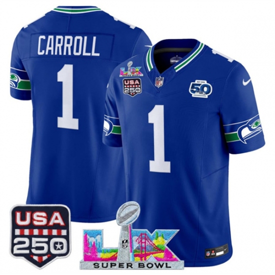 Men's Seattle Seahawks #1 Pete Carroll Royal 2025 F.U.S.E. Super Bowl LX And 50th Season & USA 250 Vapor Throwback Limited Football Stitched Jersey
