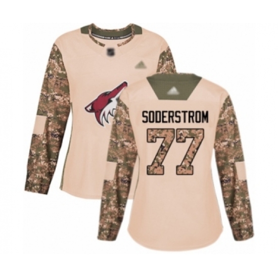 >Women's Arizona Coyotes #77 Victor Soderstrom Authentic Camo Veterans Day Practice Hockey Jersey