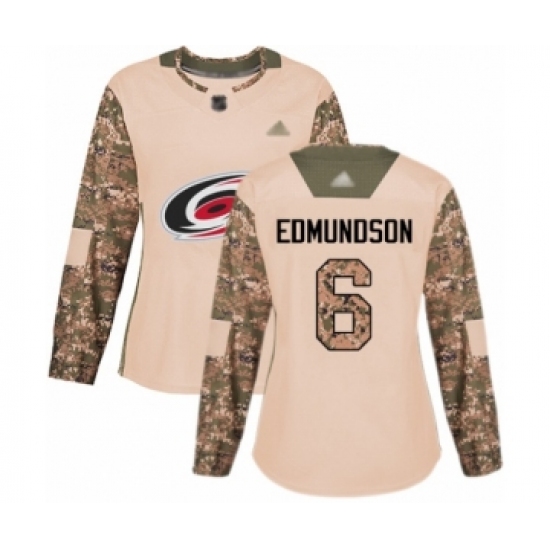 >Women's Carolina Hurricanes #6 Joel Edmundson Authentic Camo Veterans Day Practice Hockey Jersey