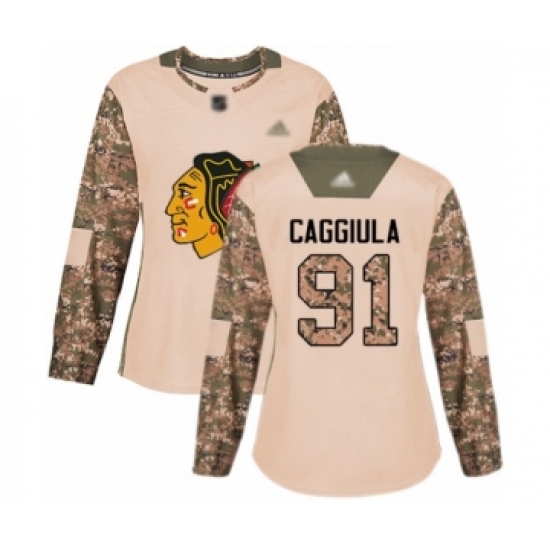 >Women's Chicago Blackhawks #91 Drake Caggiula Authentic Camo Veterans Day Practice Hockey Jersey