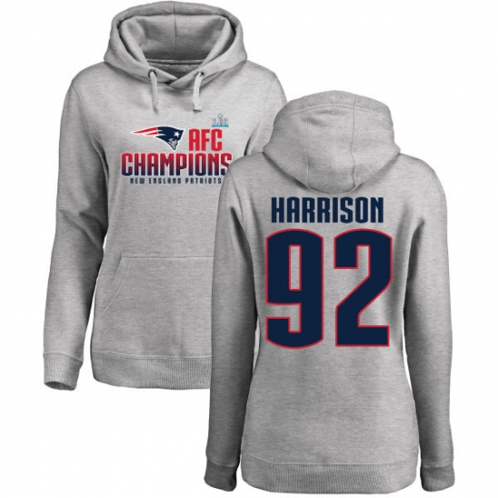 >Women's Nike New England Patriots #92 James Harrison Heather Gray 2017 AFC Champions Pullover Hoodie