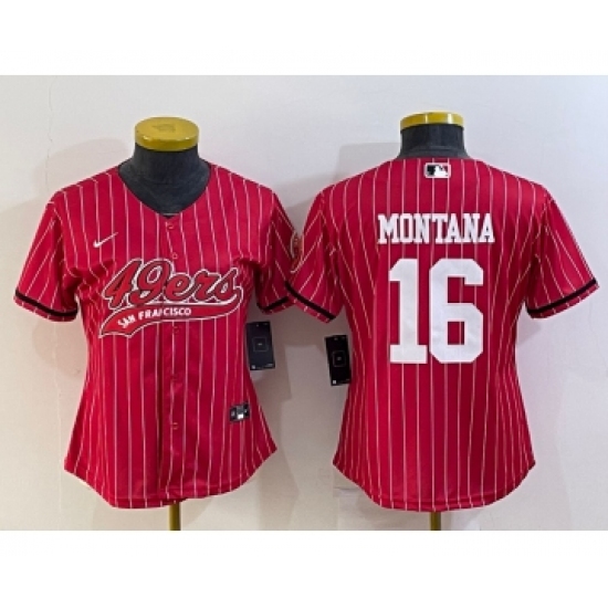 Women's San Francisco 49ers #16 Joe Montana Red Pinstripe With Patch Cool Base Stitched Baseball Jersey